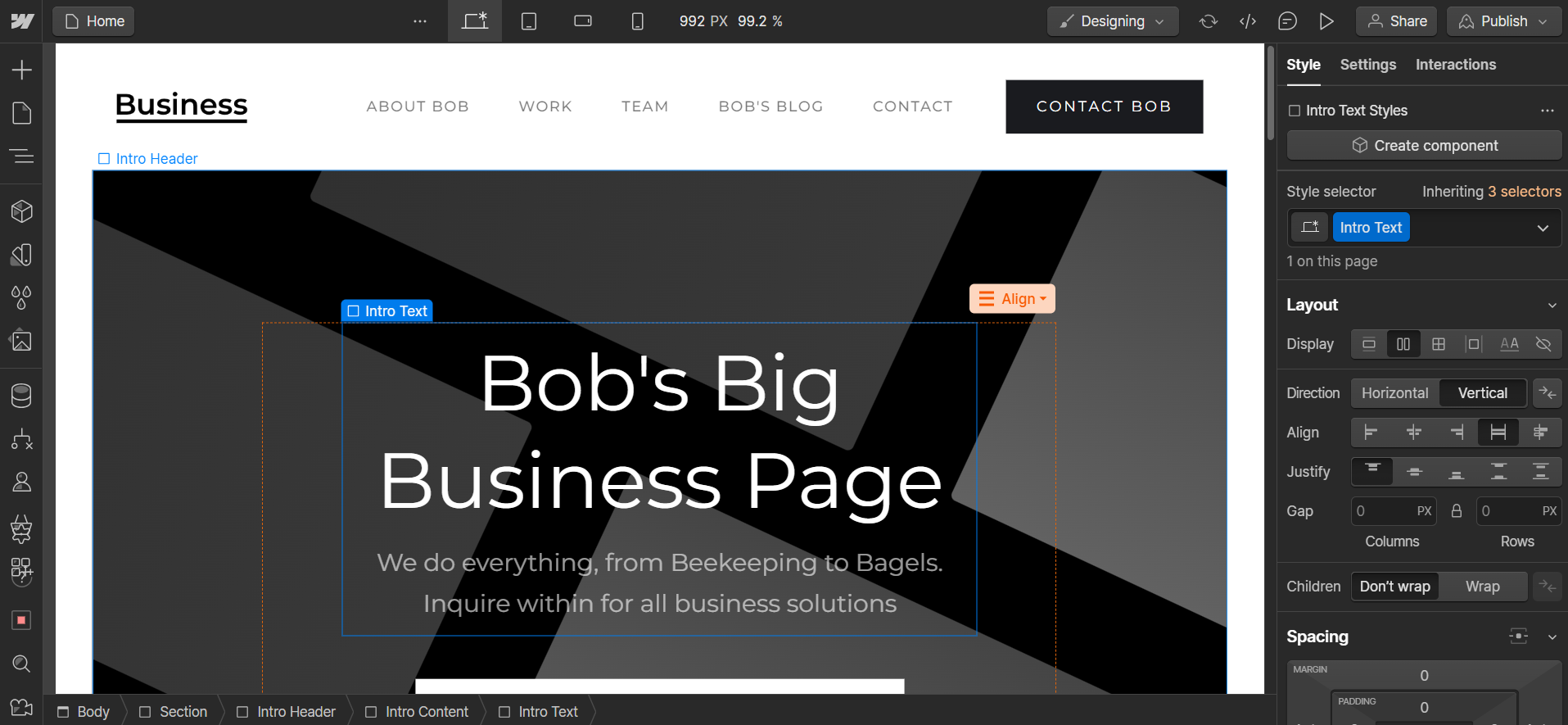 Overall, using Webflow wasn’t as easy as Wix or GoDaddy. For example, if I wanted to move the position of a header on my homepage, I couldn’t just click and drag as you would expect.
