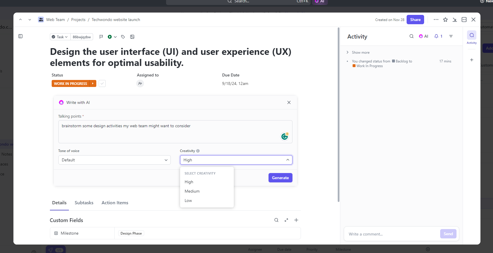 Managing a task in ClickUp. Image: Tech.co’s testing process.