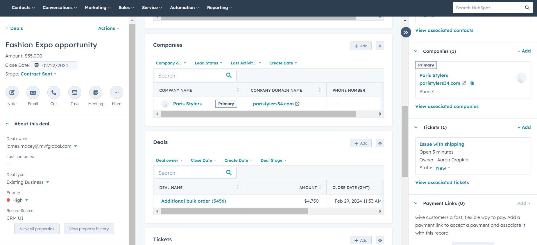 All of HubSpot’s different features or “hubs” are included in a handy toolbar along the top of the interface, which means minimal menu diving. Although they’re siloed neatly for organizational purposes, HubSpot lets you access things like issue tickets from the service hub within the “Deals” tool located in the sales areas, so you don’t have to bounce back and forth when checking information relating to a specific customer or client.